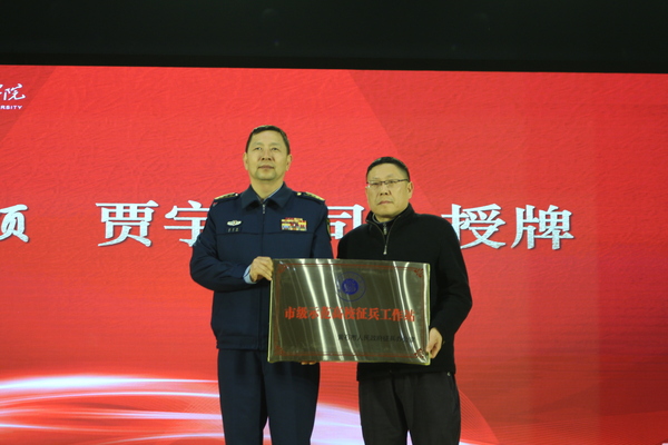 王震宣读“市级示范高校征兵工作站”授牌决定,贾宇峰为我校征兵工作站授牌,杨学斌代表学校接受授牌。