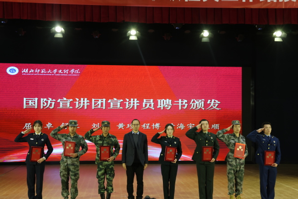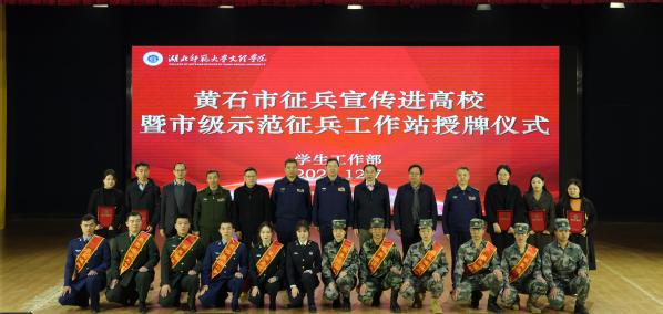 本网讯(文 张芮楠 李湘湘 图 高雨欣 黄依娜 田悦 邓司晨)12月7日上午,黄石市征兵宣传进高校暨市级示范征兵工作站授牌仪式在学术交流中心举行。黄石军分区司令员贾宇峰、处长王震,我院院长李开灿,常务副院长杨学斌,党委副书记杨之毛,及学校相关职能部门负责人等出席仪式。