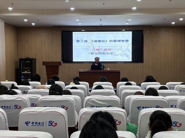 本网讯(文 刘文芳 图 周婉欣)由校党委宣传部、图书馆联合举办的“湖山讲坛”第三讲,于12月20日上午10点在图书馆报告厅开讲,湖北师范大学马克思主义学院江峰教授带来《〈道德经〉的领导与管理智慧》,此次讲座旨在通过研习经典,走进古代大哲的心灵世界,给自己无限的思考。100余名文理学子现场聆听。