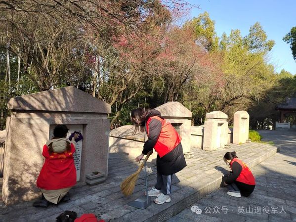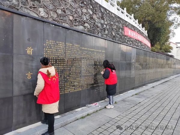 下午,在工作人员的带领下,同学们对陵园内的烈士墓进行描红、描金。“同学们,墓碑由于常年裸露在外,一定程度上出现了字体风化,对烈士墓碑进行描金、描红是一件非常严肃的工作,大家要特别注意,避免描错。”县烈士陵园管理中心的工作人员向大家讲解描绘技巧和注意事项。同学们为长眠于此的烈士轻轻擦拭墓碑,擦去灰尘,端起颜料,怀着崇高的敬意,仔细地为每一块墓碑进行描红填漆,经过一下午的努力,烈士墓碑整体焕然一新。