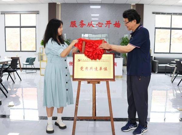 产教融合学院党总支书记周征征和章山街道文明创建负责人李晗共同为“党团共建单位”揭牌。