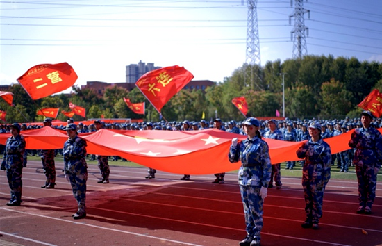 伴随着振奋人心的进行曲,分列式表演正式开始。行进、正步、敬礼,各队伍喊着响亮的口号,高举鲜红的旗帜,神采奕奕、昂首阔步地走过主席台。