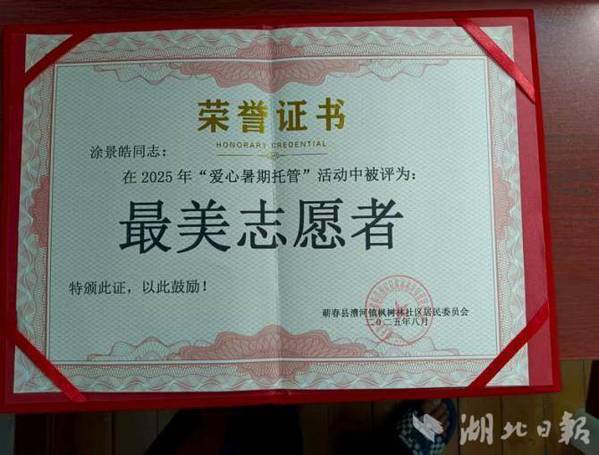 一个月的志愿服务虽短暂,却结出了丰硕成果。枫树林社区暑期爱心托管班的先进事迹被蕲春县融媒体中心新闻节目报道,蕲春县委书记胡安元等领导莅临现场参观后,也给予高度评价。因表现出色,我还被评为“情注艾都”志愿服务队“最美志愿者”。