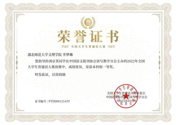 本网讯(通讯员 李梦琳)2022年12月,在由中国语文报刊协会读写教学分会面向全国高校大学生举办的“2022年全国大学生普通话大赛”中,我校“国家普通话水平测试助理团”优秀干事刘京菁荣获本科组全国一等奖(指导教师:李梦琳)。