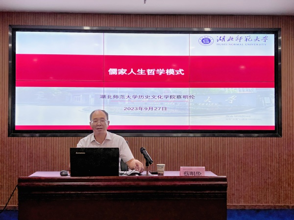 湖北师范大学留联会会员、历史文化学院院长蔡明伦教授以《儒家人生哲学模式》为题,开启了“湖山讲坛”第一讲。他从“儒家理想人格”“三纲八目与大同世界”“内圣与外王 ”“正己正人与成己成物 ”“穷独与达兼”五个方面,系统地阐释了儒家所追求天下为公、天下大同的社会理想和修齐治平、兴亡有责的家国情怀。