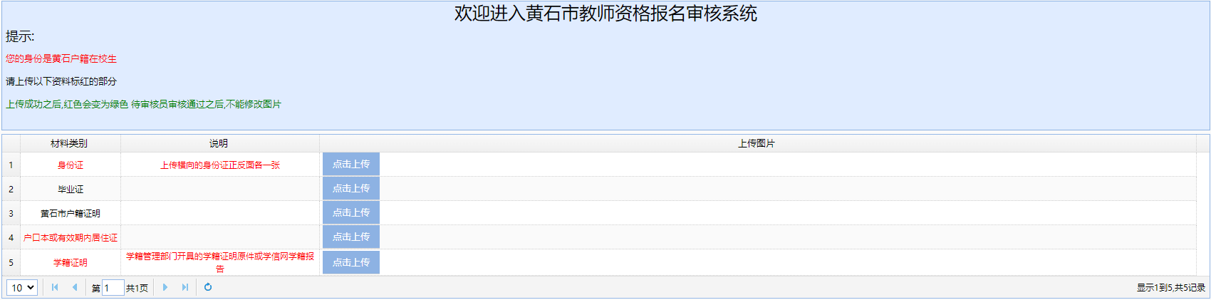 注意:请各位考生上传材料到黄石市教师资格报名审核系统后,务必返回在中国教育考试网(ntce.neea.edu.cn)中查看审核状态。如审核状态为“不通过”,请重新提交报考信息,等待审核。否则审核系统中因看不到您的报考信息,无法审核。