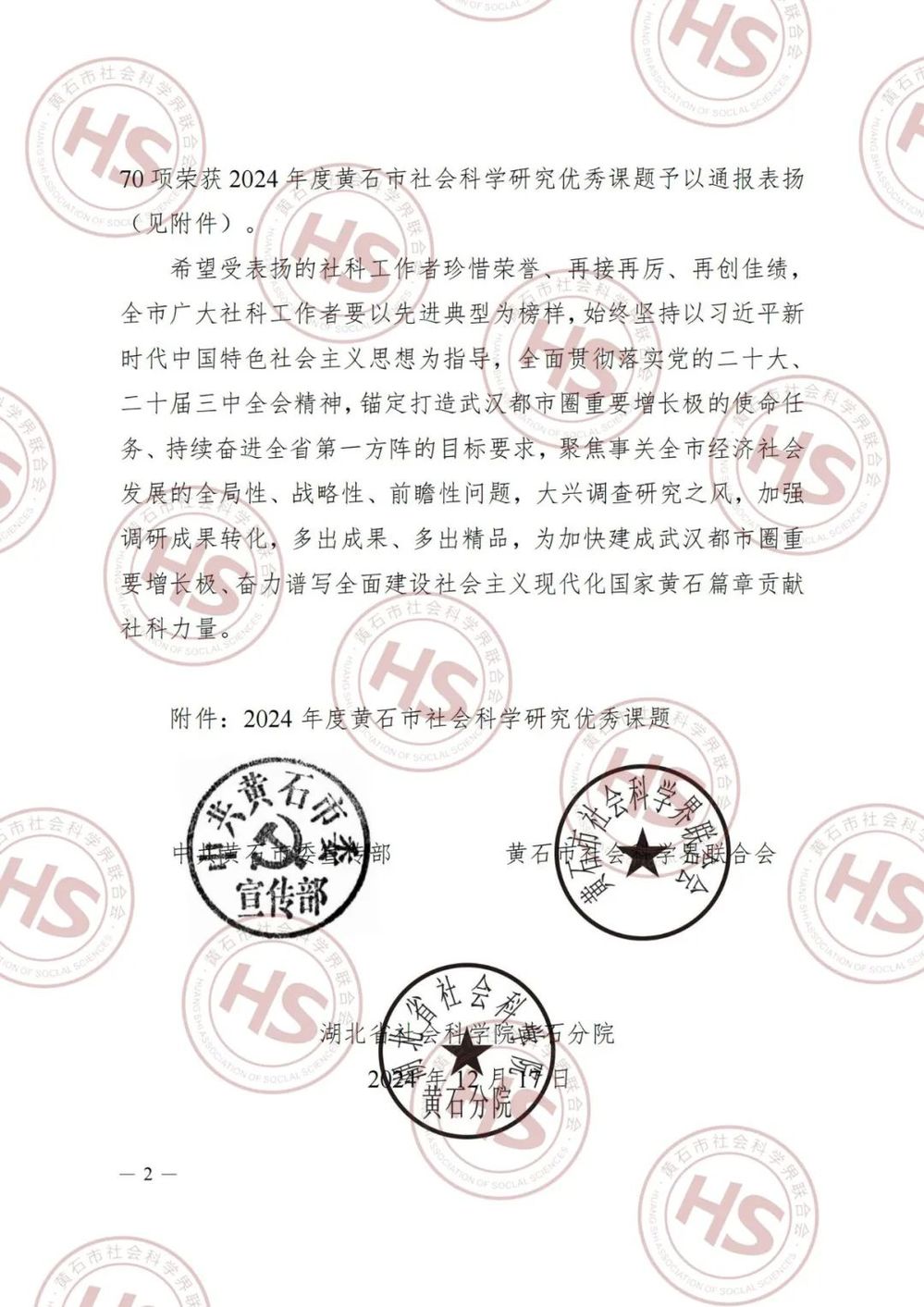 2024年,黄石各地各单位认真落实《关于2024年度黄石市社会科学研究课题立项的通知》要求,深入开展调查研究,精心完成课题报告,形成了一批优秀成果。经专家评审,从几百个立项成果中共评出70项优秀课题。全校共获得2项,我部胡蕾老师获此殊荣。
