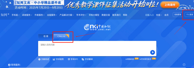 访问方式:登录知网首页www.cnki.net,后切换至CNKI AI进入。右上角机构登录显示“拼搏app官方在线入口”后,点击右上角“个人登录”,注册/登录个人账号后登录使用。