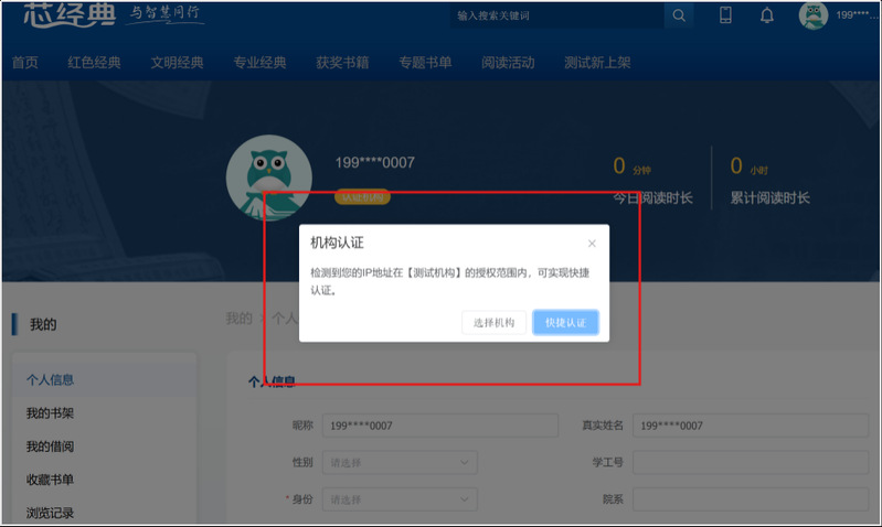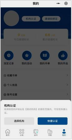 第三步:账号注册后,选择认证机构,弹出机构认证页面,点击【快捷认证】或选择/检索【拼搏app官方在线入口】实现认证后开启阅读学习之旅。