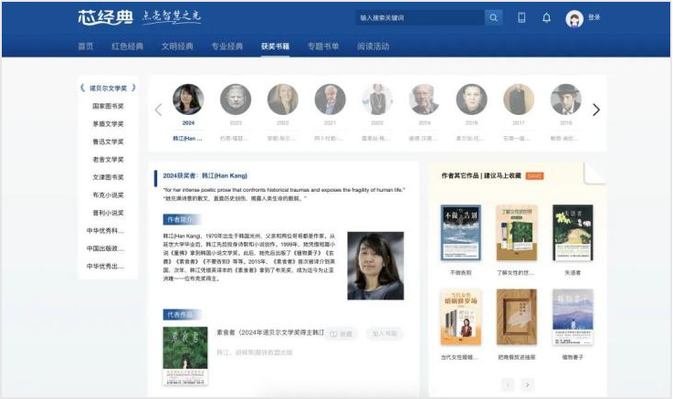 平台收录诺贝尔文学奖、茅盾文学奖、鲁迅文学奖等多项全球顶尖文学殿堂级的图书作品。