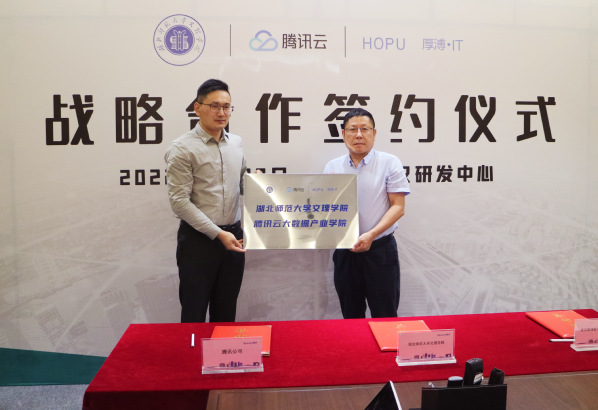 2022年6月23日,我校与腾讯云计算(北京)有限责任公司、武汉厚溥数字科技有限公司在腾讯武汉研发中心举行“产教融合共建腾讯云大数据产业学院”签约仪式。学校董事长李咏成、院长李开灿、常务副院长杨学斌、副院长张志华、副院长王胜国出席签约仪式。