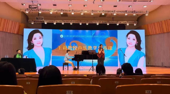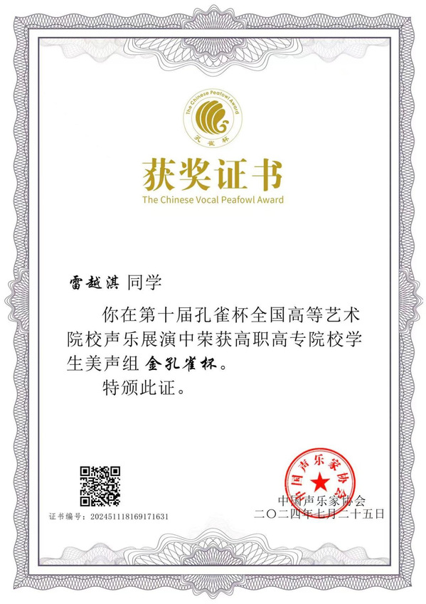 本网讯(通讯员 徐乔婕)7月18日至7月25日第十届孔雀杯全国高等艺术院校声乐展演暨第八届高校声乐学术交流活动在华南师范大学音乐学院举行。我校教育与艺术学部23级音乐教育2302班的雷越淇同学(指导教师高月霞)以决赛第一名的成绩获得高职高专组金孔雀。这是我校学子在国家级声乐比赛中获得的又一次突破。在展演活动中雷越淇同学还被选中青歌赛金奖获得者王莉教授声乐大师班,受到王莉教授高度评价。